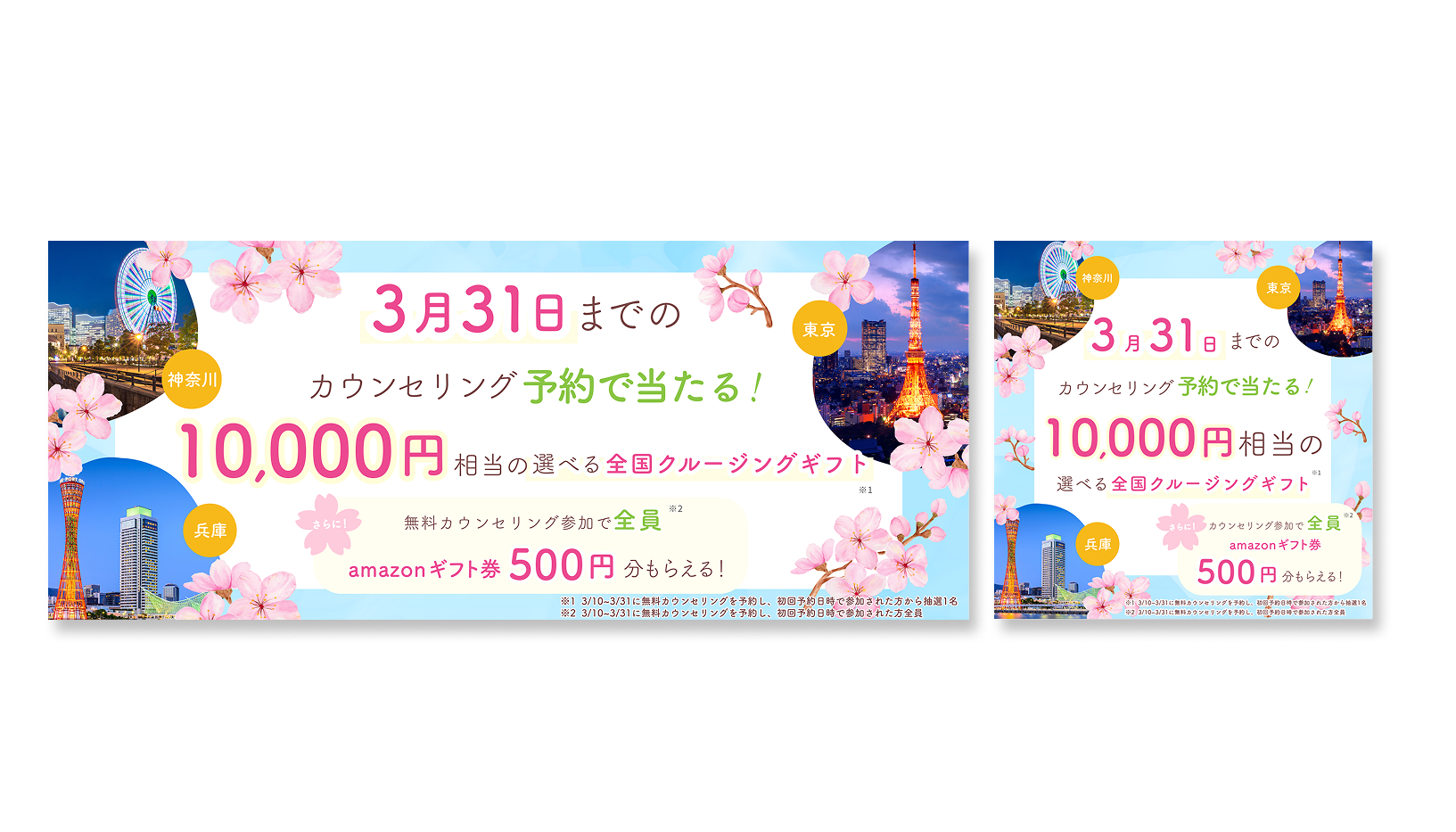 - バナー作成【製作時間】3時間/1枚【使用ソフト】Photoshop・illustrator【担当業務】デザイン【意識した亊】春らしい季節感が伝わるデザインにしました。